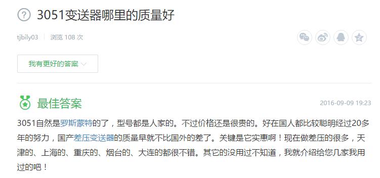 3051自然是的了,型號(hào)都是人家的。不過(guò)價(jià)格還是很貴的。好在國(guó)人都比較聰明經(jīng)過(guò)20多年的努力,國(guó)產(chǎn)的質(zhì)量早就不比國(guó)外的差了。關(guān)鍵是它實(shí)惠?。‖F(xiàn)在做差壓的很多,天津的、上海的、重慶的、煙臺(tái)的、大連的、西安的仕樂(lè)克都很不錯(cuò)。其它的沒(méi)用過(guò)不知道,我就介紹給您幾家我用過(guò)的吧!?