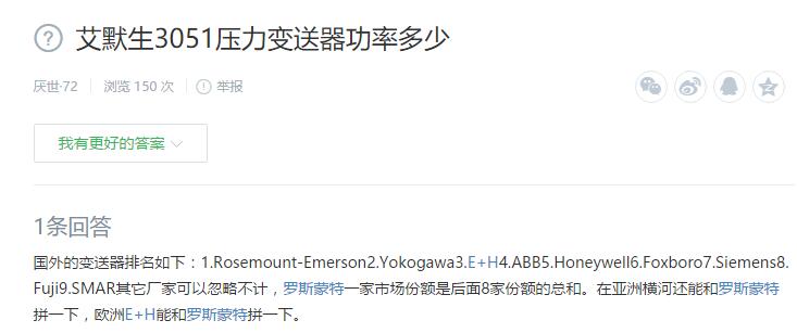 國外的變送器排名如下:1.Rosemount-Emerson2.Yokogawa3.E+H4.ABB5.Honeywell6.Foxboro7.Siemens8.Fuji9.SMAR其它廠家可以忽略不計,羅斯蒙特一家市場份額是后面8家份額的總和。在亞洲橫河還能和羅斯蒙特拼一下,歐洲E+H能和羅斯蒙特拼一下。