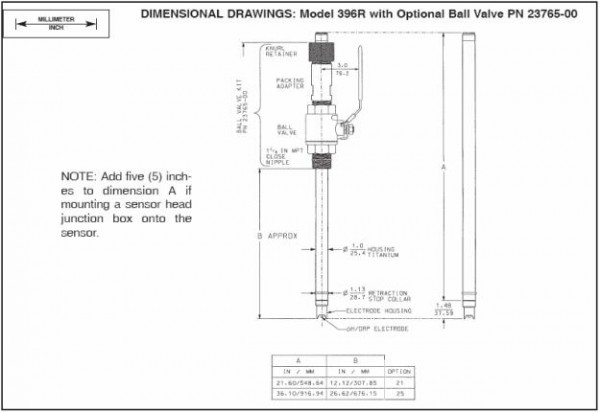 396R 傳感器本體是鈦材,帶獲得專利的聚丙烯參比電極液體接界、鈦接地極和球閥(后者要分別采購(gòu)),適用于某些不能停產(chǎn)的流通式安裝需要。傳感器是鈦材套管的玻璃電極(pH) /鉑電極(ORP),測(cè)溫?zé)犭娮枋荘t100 或 3K Balco。 396R 傳感器不內(nèi)置前置放大器,配 15 英尺或者 9.5 英寸的電纜。如果分析儀或變送器內(nèi)沒(méi)有前置放大器,則即便傳感器的電纜為 15 英尺,也要另外采購(gòu)內(nèi)置前置放大器的接線盒。此外,過(guò)程接頭和球閥附件也要另行采購(gòu)。