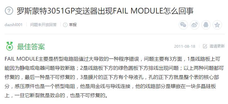 3、羅斯蒙特3051GP變送器出現(xiàn)FAIL MODULE怎么回事?