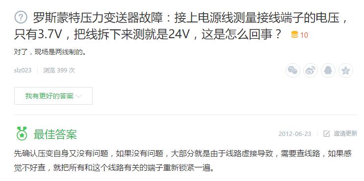 1、羅斯蒙特壓力變送器故障:接上電源線測(cè)量接線端子的電壓,只有3.7V,把線拆下來測(cè)就是24V,這是怎么回事?(對(duì)了,現(xiàn)場(chǎng)是兩線制的。)