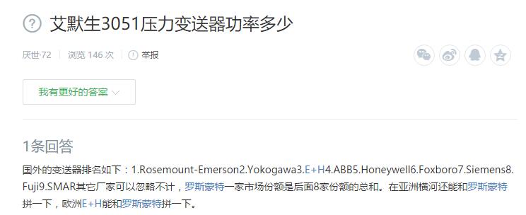 國外的變送器排名如下:1.Rosemount-Emerson2.Yokogawa3.E+H4.ABB5.Honeywell6.Foxboro7.Siemens8.Fuji9.SMAR其它廠家可以忽略不計(jì),羅斯蒙特一家市場(chǎng)份額是后面8家份額的總和。在亞洲橫河還能和羅斯蒙特拼一下,歐洲E+H能和羅斯蒙特拼一下。