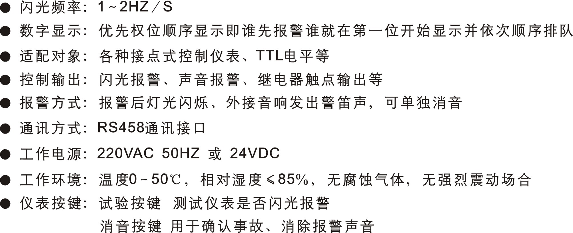 XXS系列八路閃光報警器與SLK系列控制儀表或其它接點式控制檢測儀表配套使用,能同時檢測八路輸入信號,八路信號均采用規(guī)模、高亮度數(shù)碼管色塊或數(shù)字分別顯示各通道的當(dāng)前狀態(tài),輸入信號可以為接點式開路信號、接點式閉路報警或TTL電平。儀表具有多種報警控制輸出方式,自由選擇閃光報警、聲音報警、繼電器報警觸點控制輸出、報警記憶及優(yōu)先權(quán)數(shù)字顯示等功能。